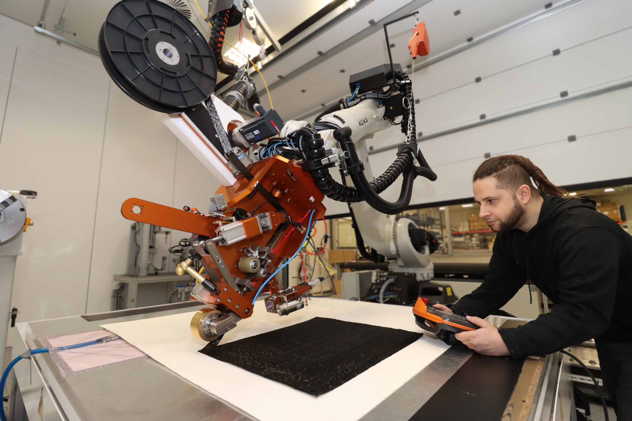 Unidirektional verstärkte Tapes sind Schlüsselmaterialien für den effizienten und nachhaltigen Leichtbau. Sie ermöglichen es, Bauteile gezielt, ressourcenschonend und leistungsoptimiert herzustellen, indem Fasern exakt dort platziert werden, wo sie für die mechanische Belastung benötigt werden. Damit stehen maßgeschneiderte Halbzeuge für den Leichtbau zur Verfügung. Auf der K-Messe zeigt das TITK hierzu die Ergebnisse eines Forschungsprojekts. Konkret: neue, trockene Schmalbandgelege auf Basis von 50K Carbonfaserrovings.